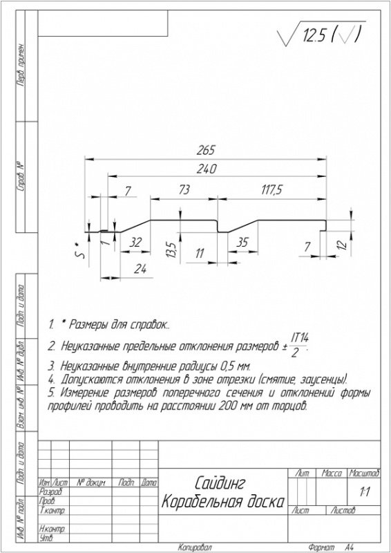 Сайдинг «Корабельная доска» изготавливается любой длины до 6 м из металла толщиною 0.4 - 0.5 мм. Система монтируется на облегченную вертикальную подконструкцию.